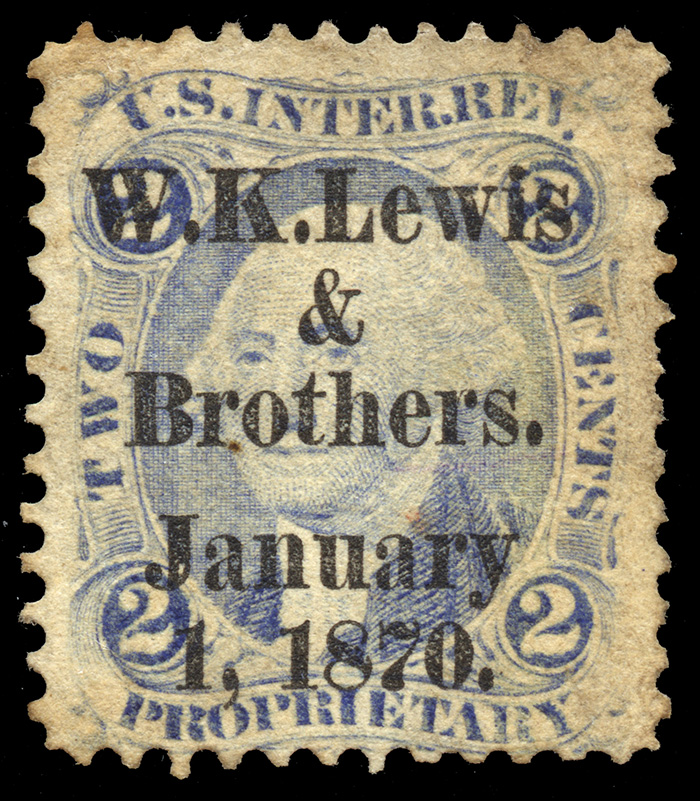W.K. Lewis & Brothers. Morrissey Type 3. W.K. Lewis was a cannery. Very scarce on the 2-cent ultramarine.
