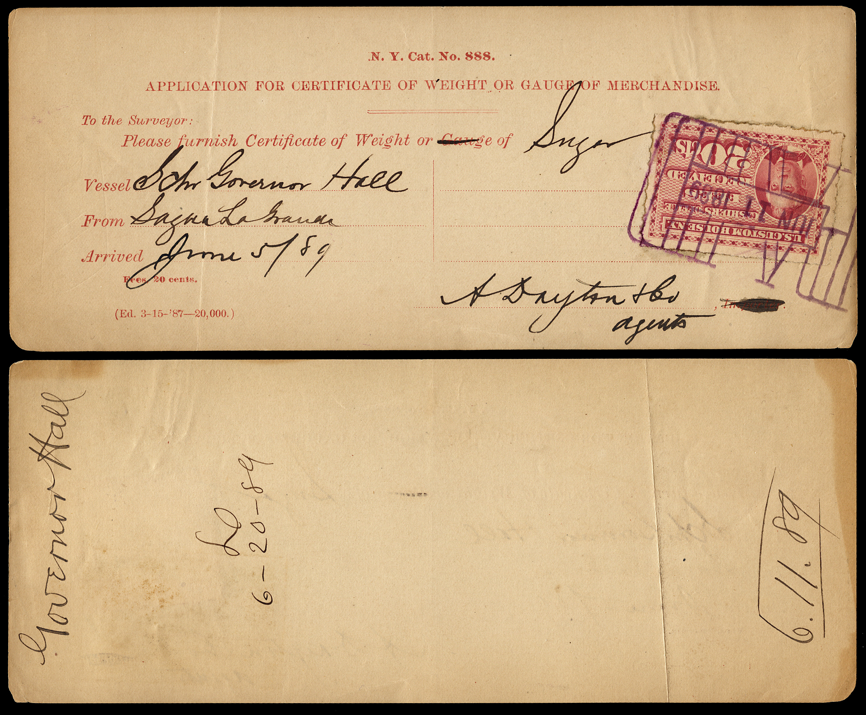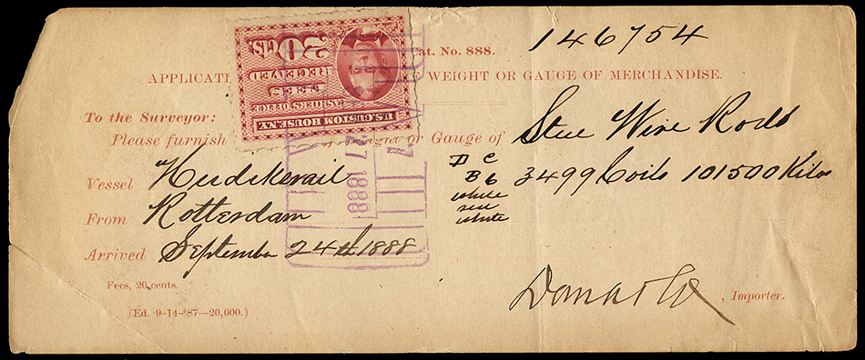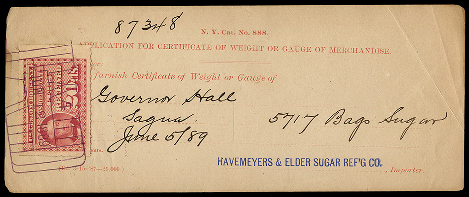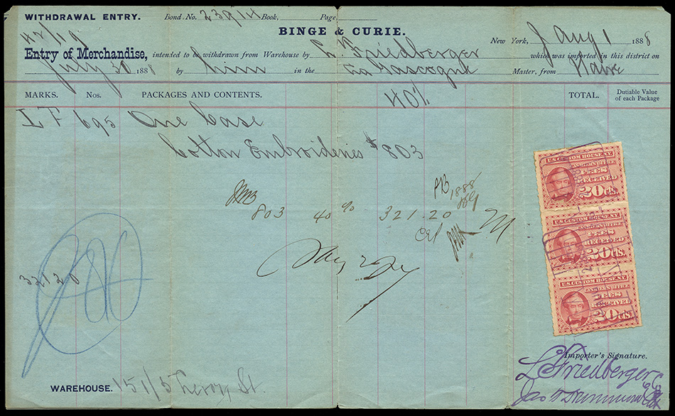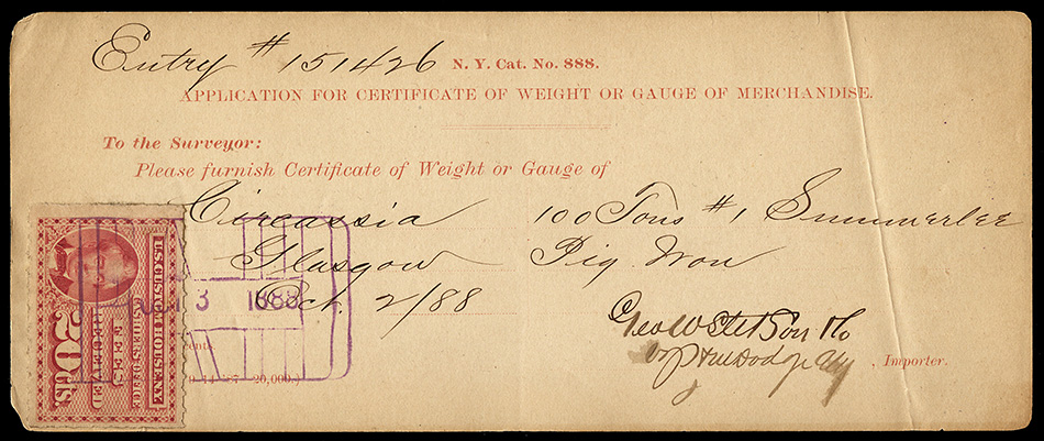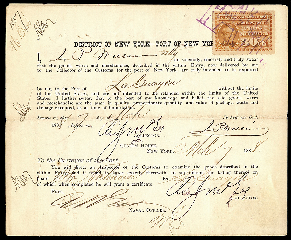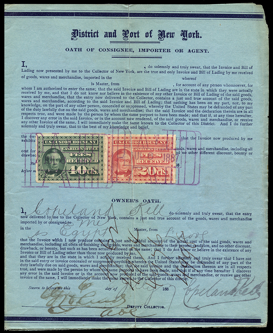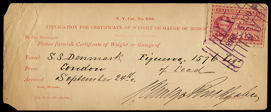 Even though the use of customs fee stamps was not formally authorized until July 9, 1887, the New York Customs House apparently was using the stamps prior to this. I have a document (see census below) dated July 6, 1887, and have seen a stamp cancelled as early as June 30, 1887: