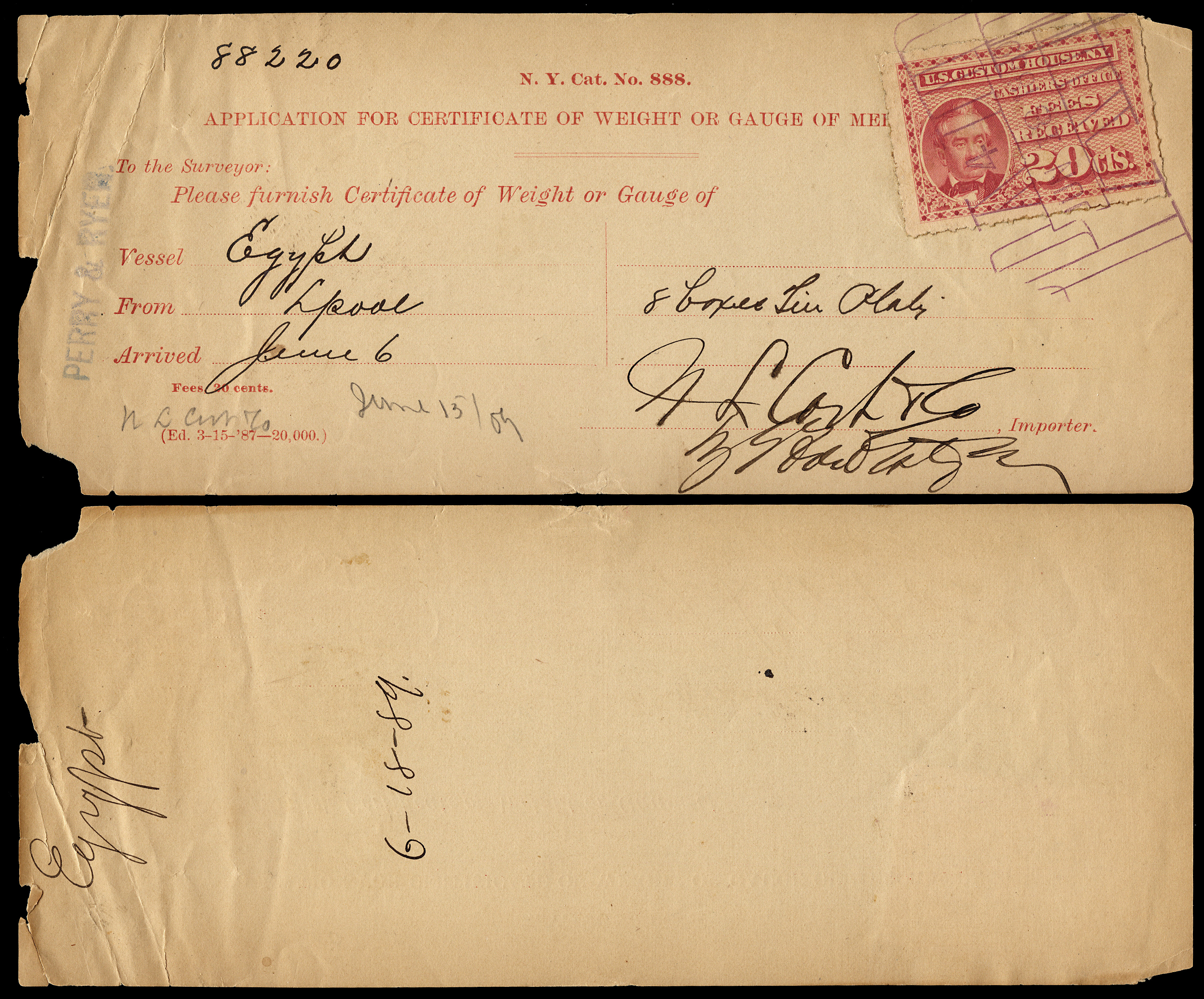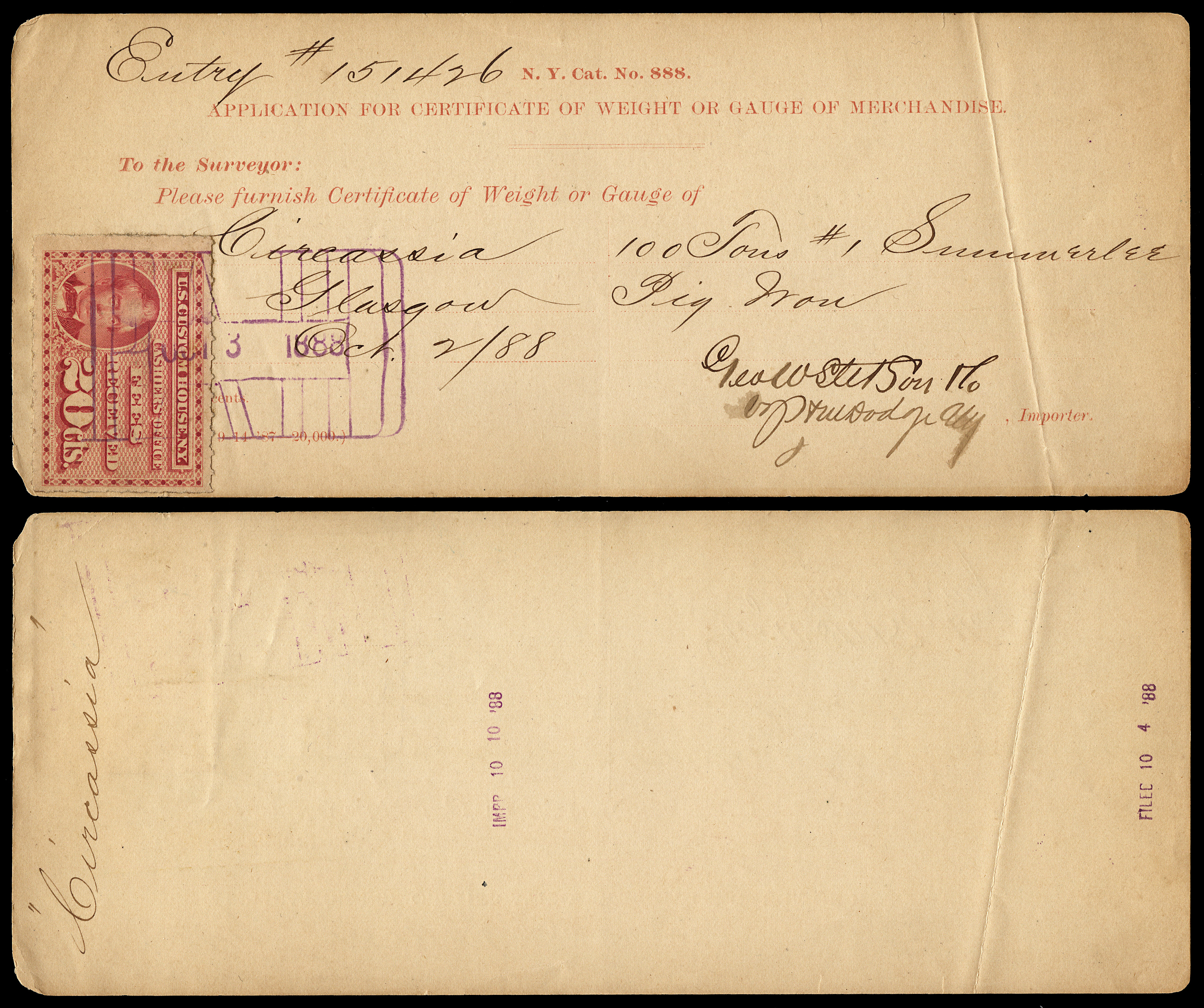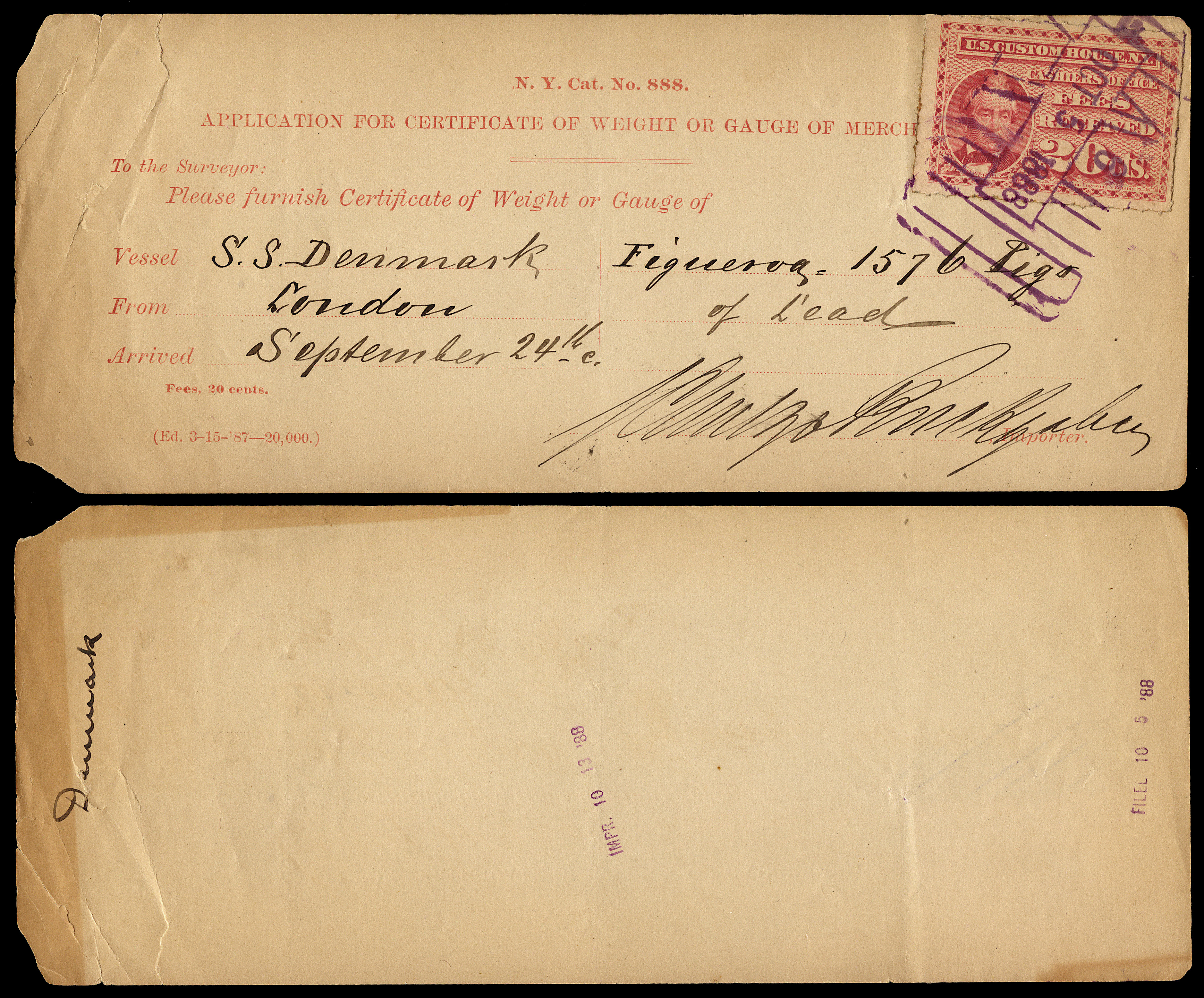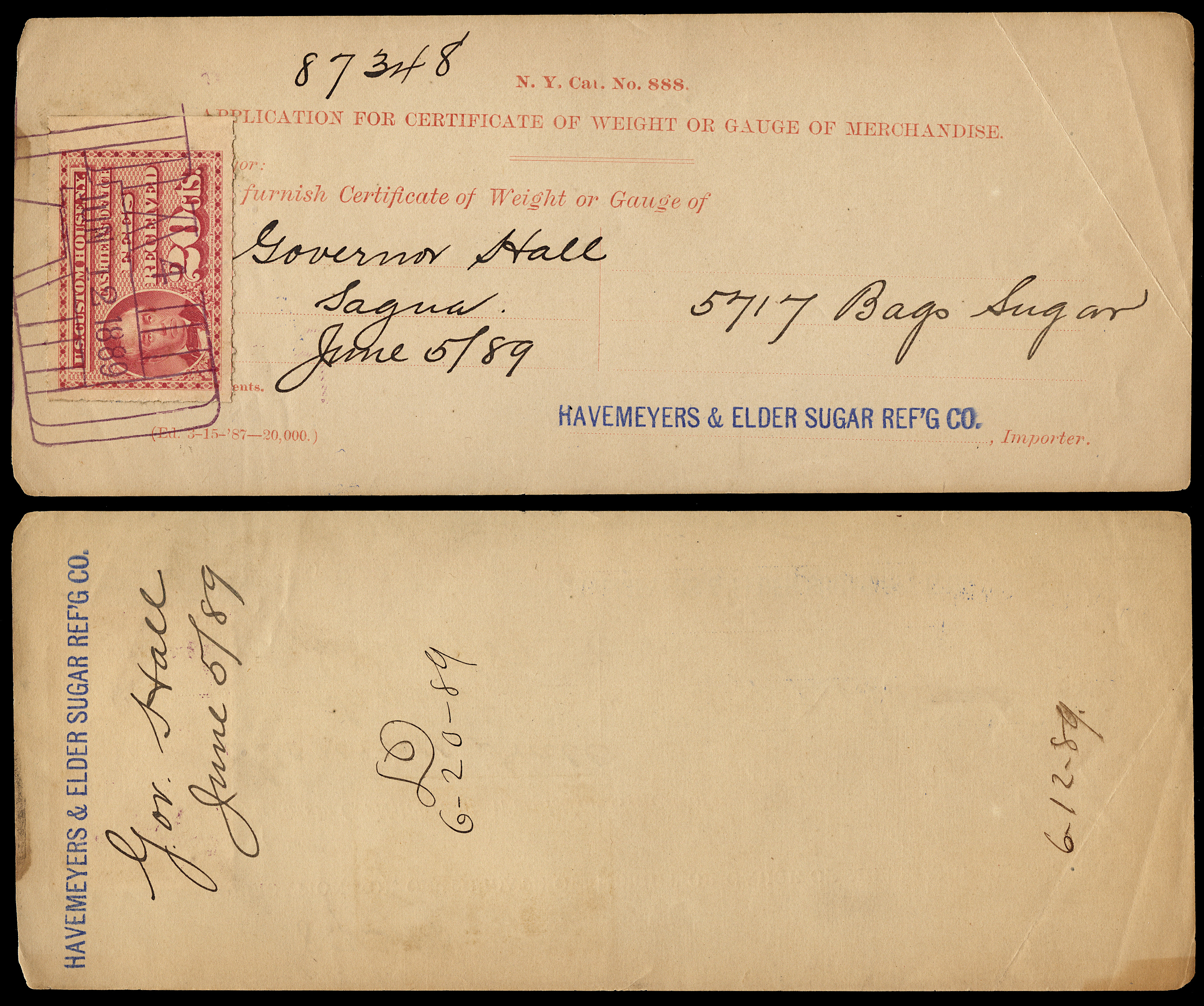 Even though the use of customs fee stamps was not formally authorized until July 9, 1887, the New York Customs House apparently was using the stamps prior to this. I have a document (see census below) dated July 6, 1887, and have seen a stamp cancelled as early as June 30, 1887: