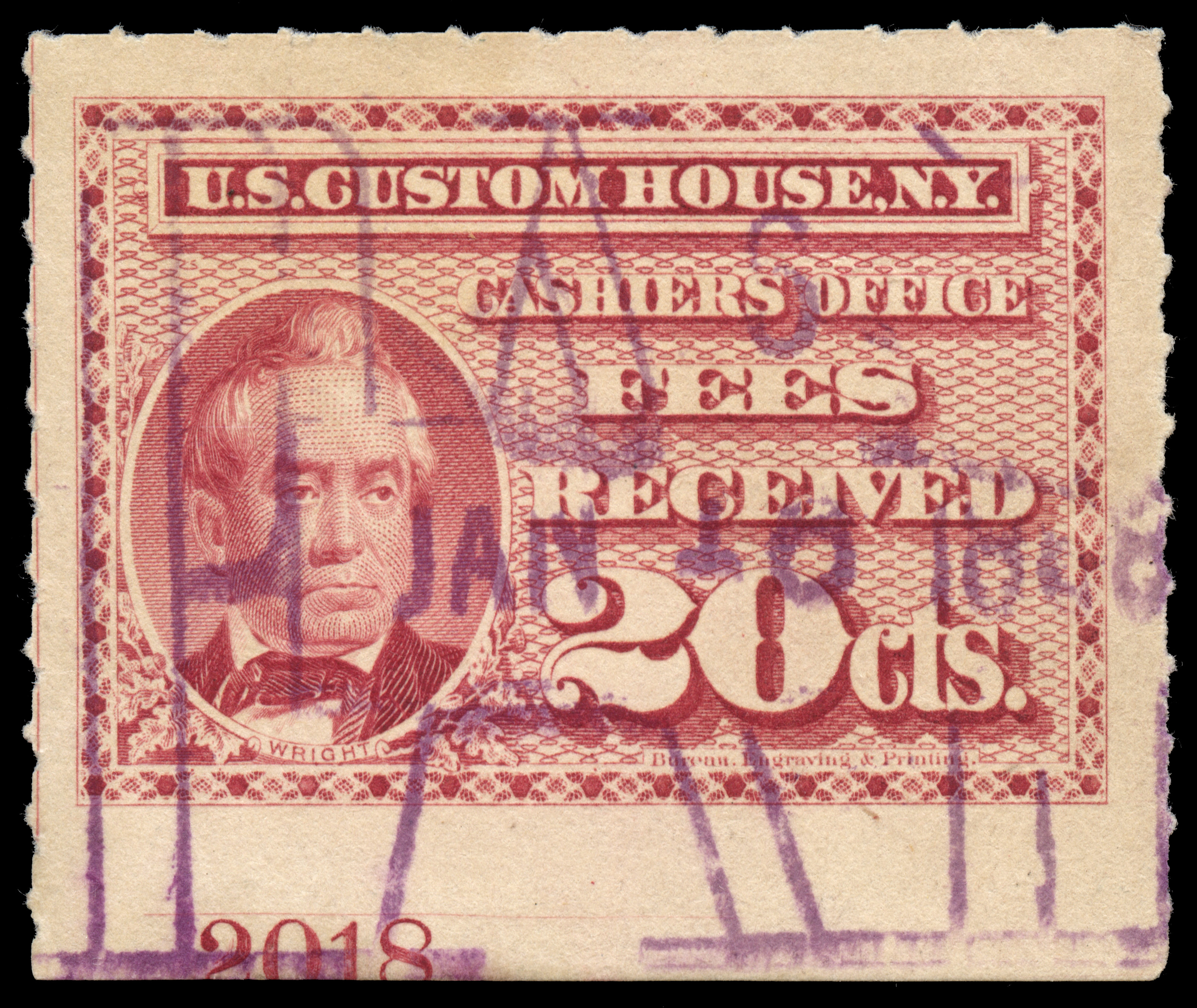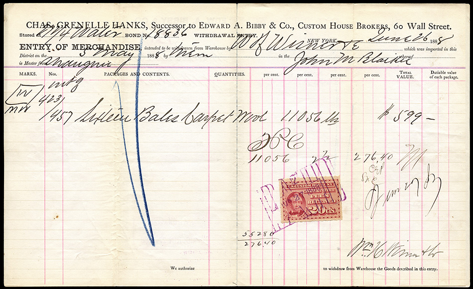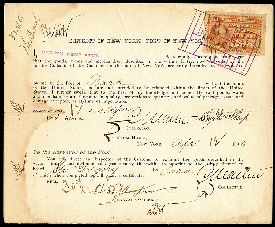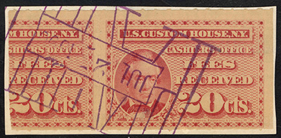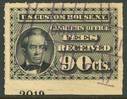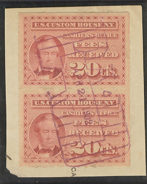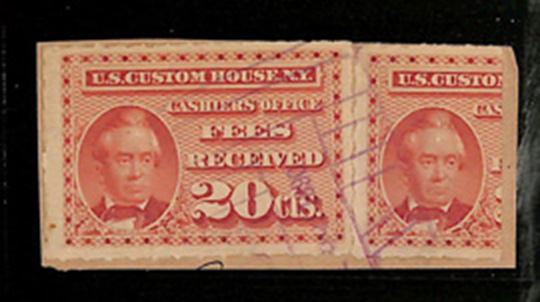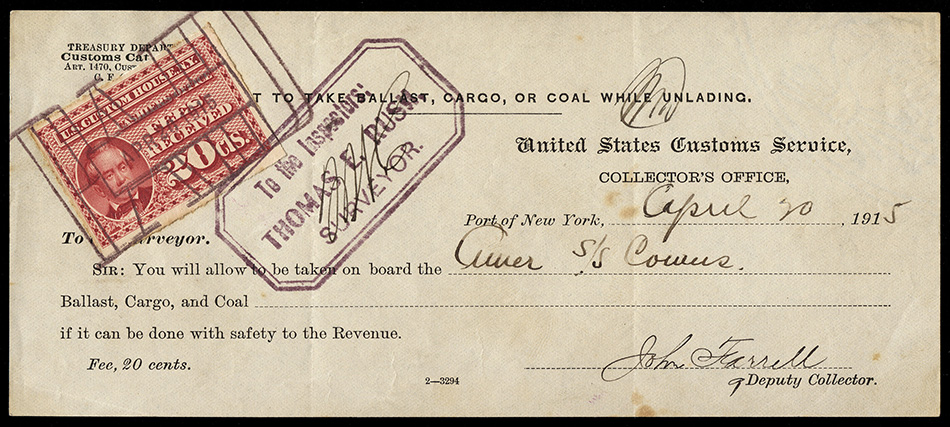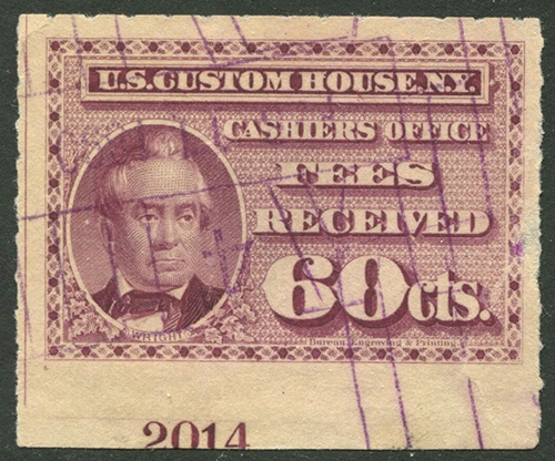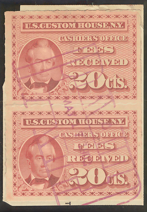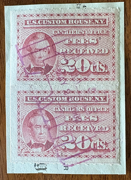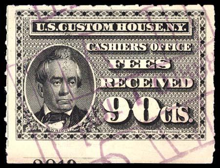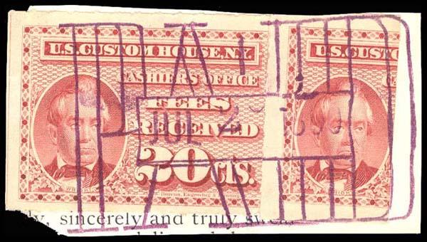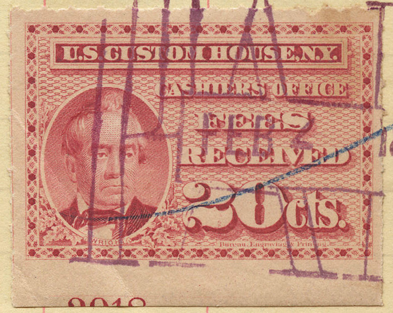 I found it interesting that while these are categorized as federal revenue stamps, their use was relegated solely to the New York Custom House... not any of the other major port cities. Why were they not adopted or mandated elsewhere? Insufficient volume of traffic to justify doing so?