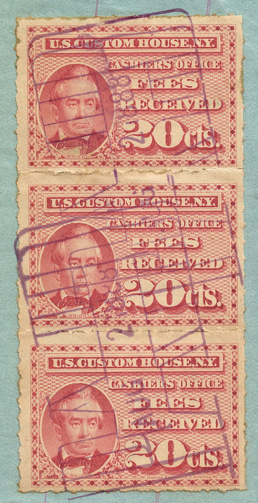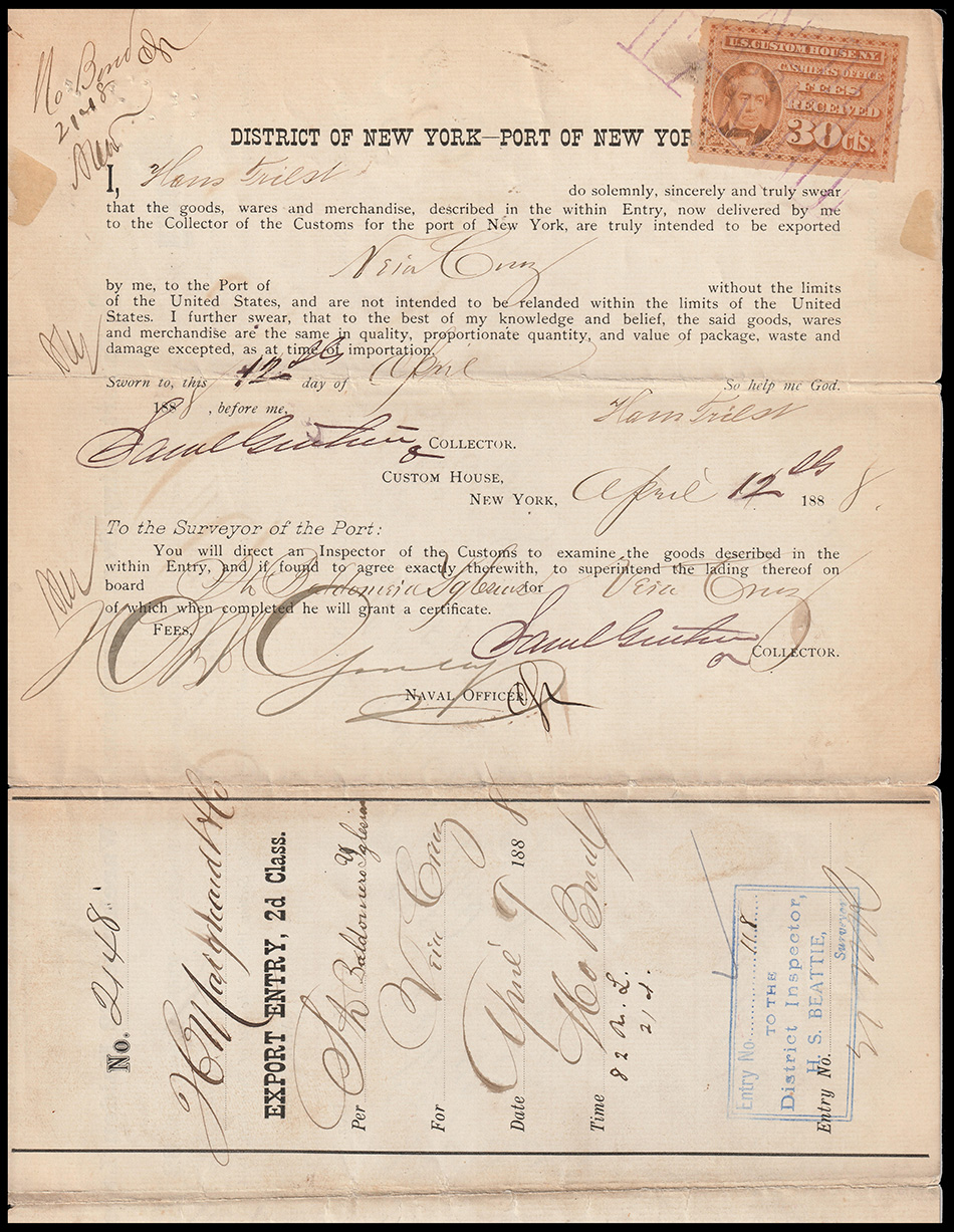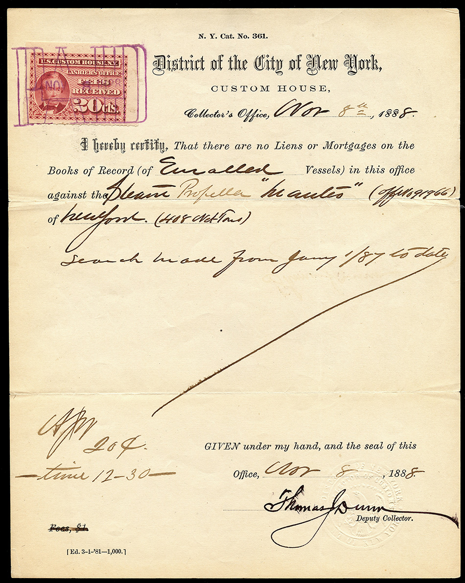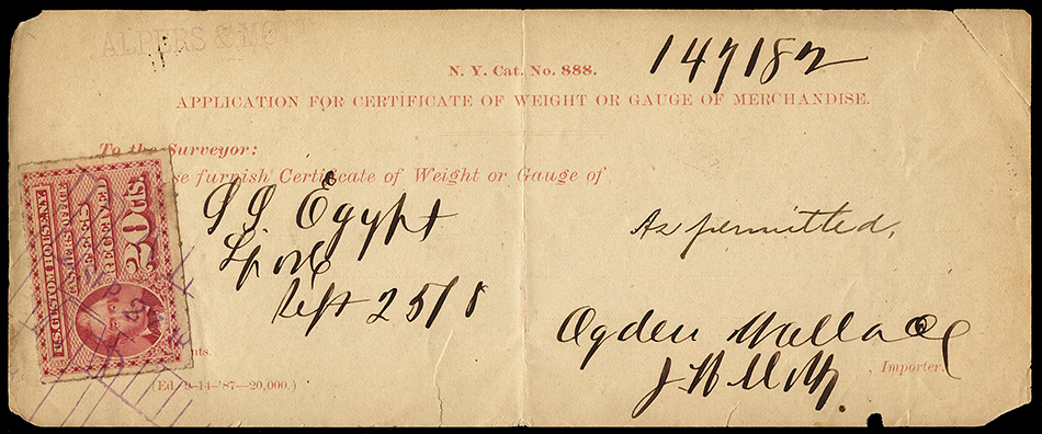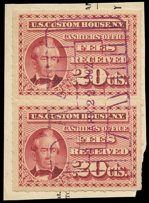 I found it interesting that while these are categorized as federal revenue stamps, their use was relegated solely to the New York Custom House... not any of the other major port cities. Why were they not adopted or mandated elsewhere? Insufficient volume of traffic to justify doing so?