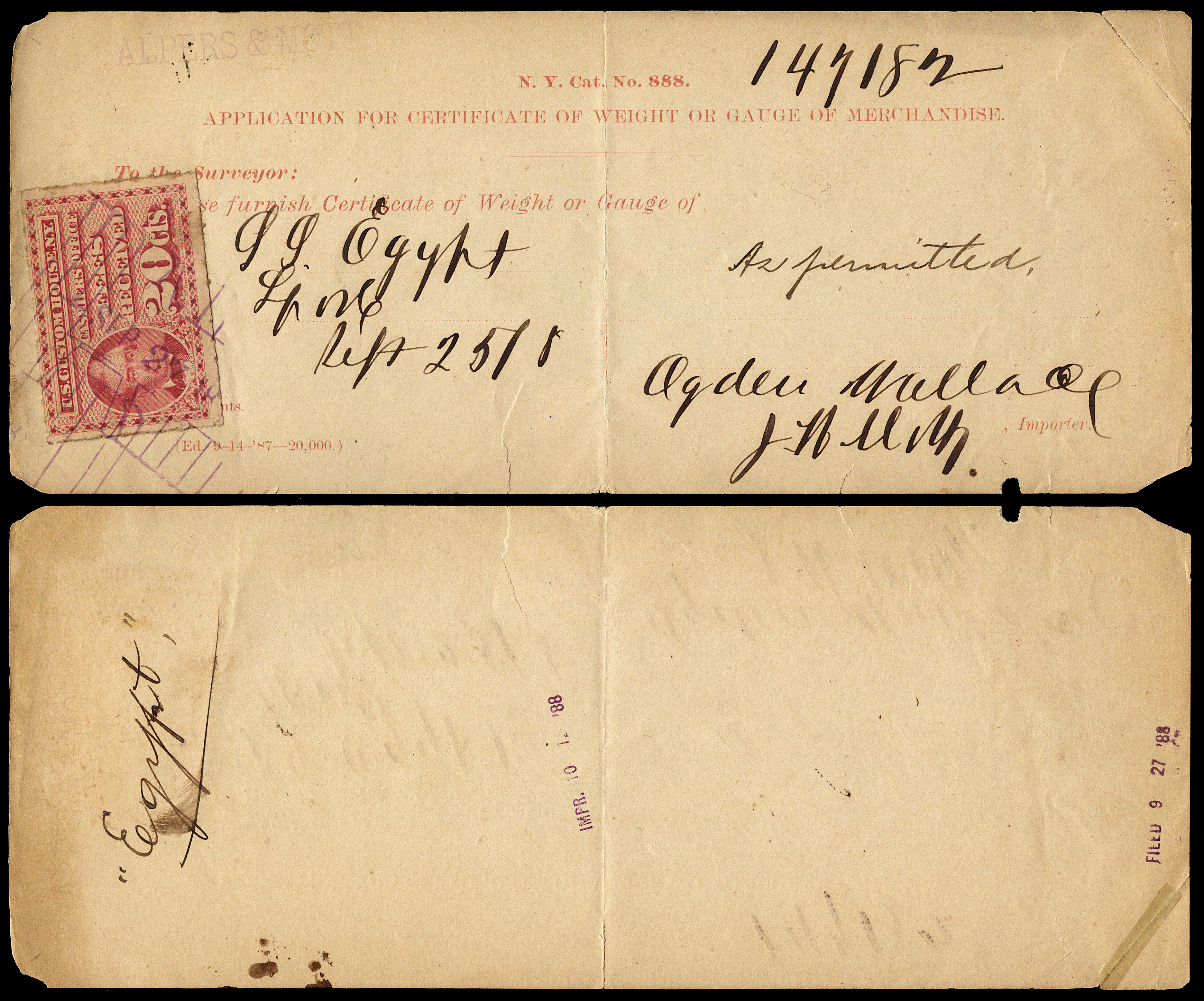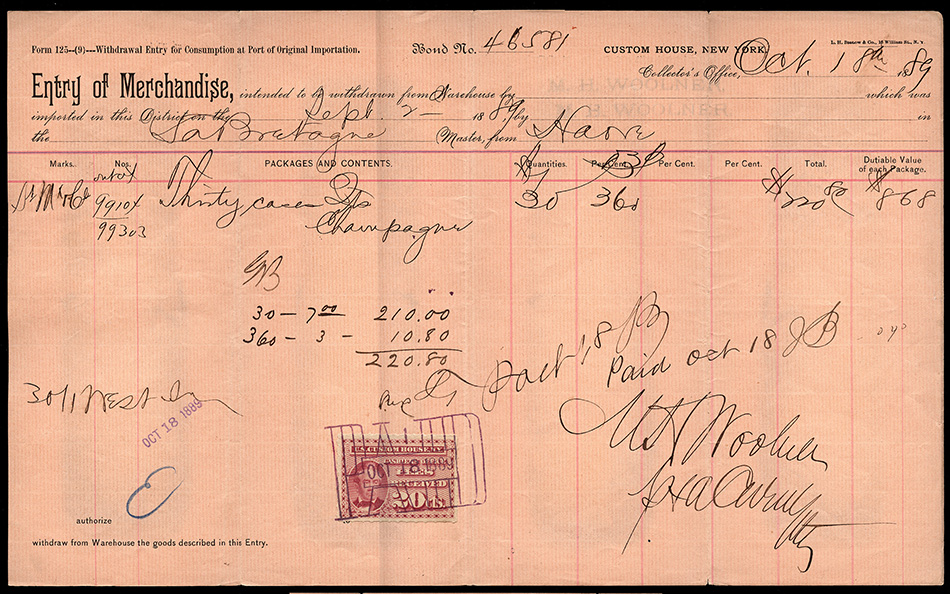 These fees were not initially paid for via stamps, but rather a cash-receipt ledger system. Fast forward almost a decade, to 1886, when Daniel Magone was appointed Collector of the Port of New York by President Grover Cleveland. He was actively interested in the aggressive reform of "antiquated methods" at the New York Custom House. In June and July 1887, he appointed a special commission, led by Treasury Agent A. K. Tingle, to investigate and simplify the "circumlocution" of business methods at the port.
