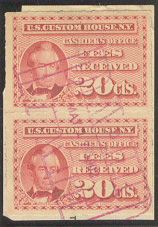 U.S. Customs Fee stamps (Scott #RL series) never were really a focus of mine until recently. They are a very short run of stamps, with #RL1 through RL8 issued in 1887 and then RL9 issued in 1914. I had seen examples on document occasionally, typically commanding $150-300 each, all with singles of Scott #RL1, the 10-cent dull rose. I picked up a tattered example from Richard Friedberg at Chicagopex a few years ago.