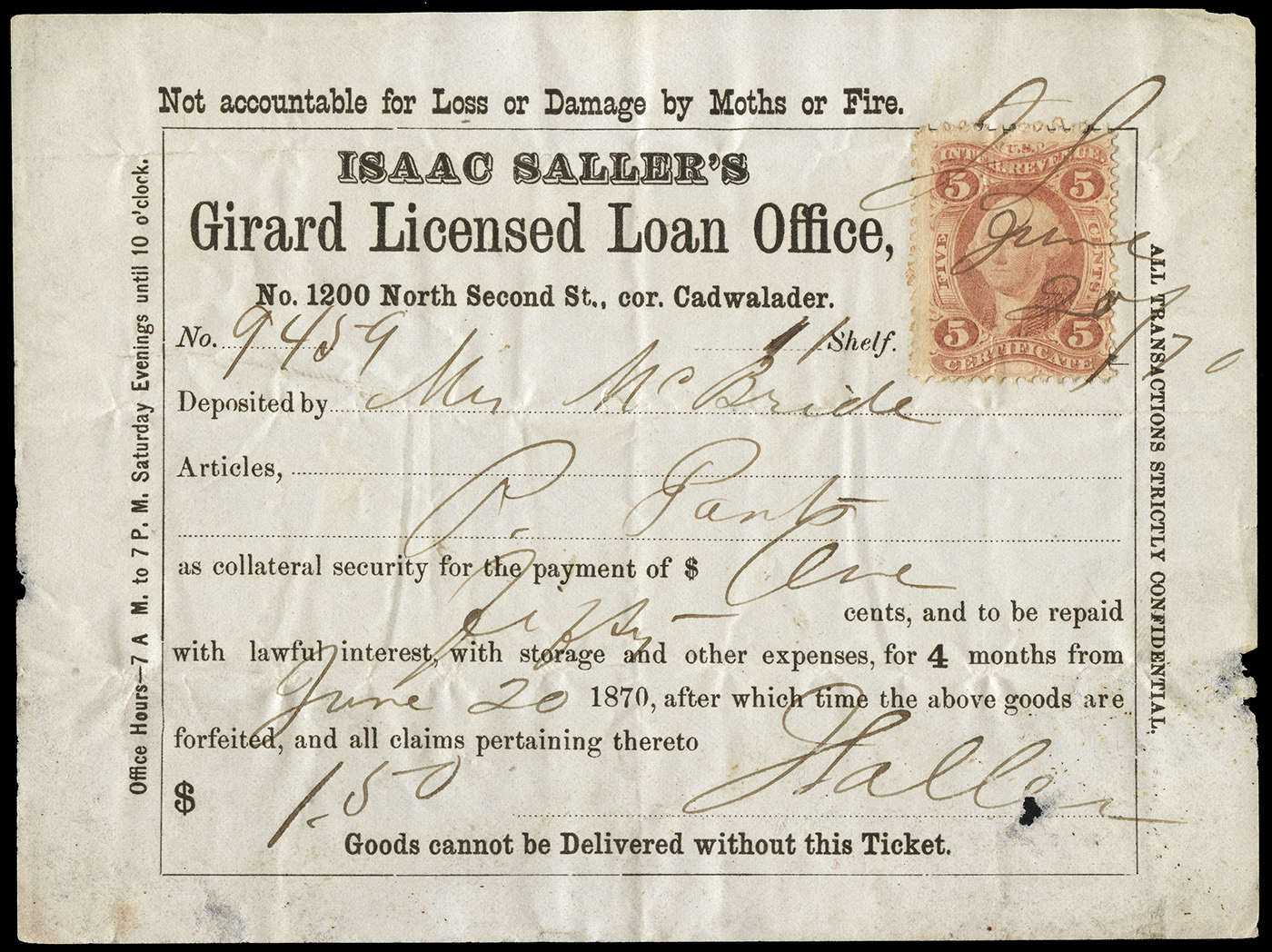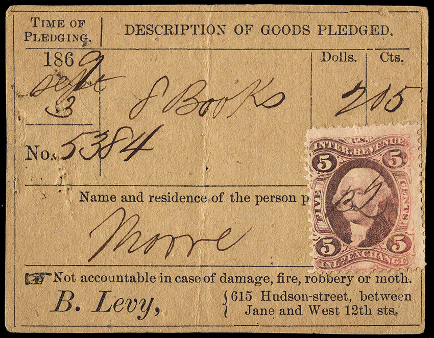 Extremely rare document, with only 2-3 examples known. Pawn tickets, like baggage tickets, railway passes, steamship passes, etc., where extremely ephemeral. Once the immediate task at hand was completed, there was no reason to retain the document any longer, so virtually none were saved... unlike financial transactional documents (e.g., checks, deeds, stock certificates) or legal documents, where medium- to long-term filing and storage was required, so more survived.