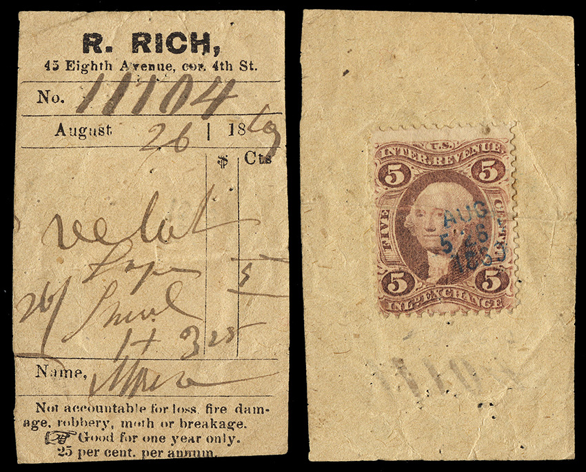 Scott #26, demonetized at this point, used illegally as a revenue stamp on an 1869 estate receipt, with an R24c on the reverse paying a certificate tax for a court filing.