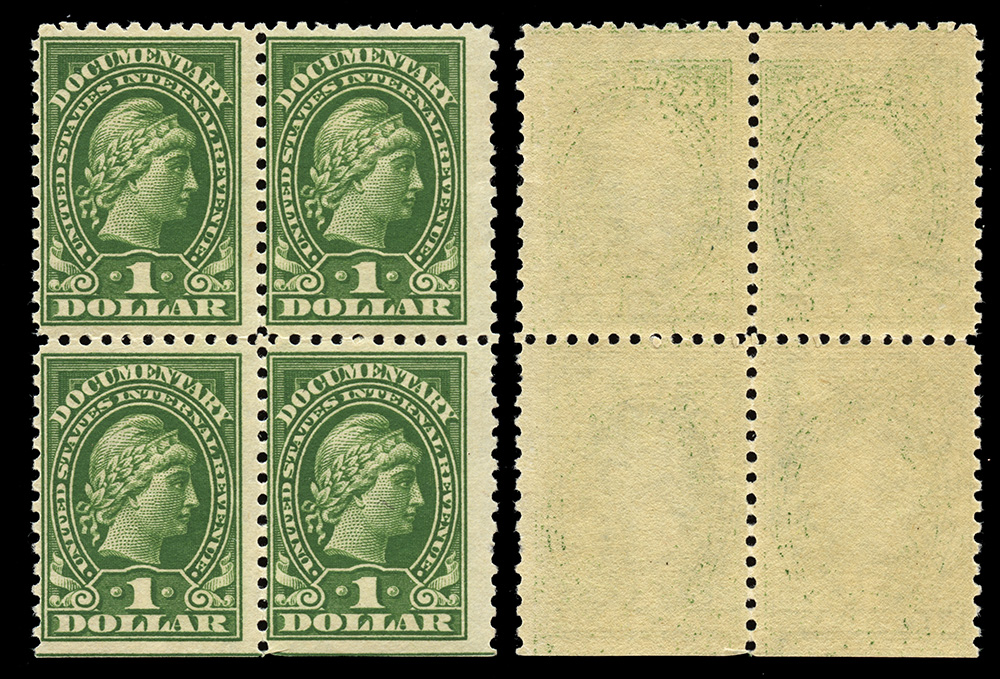Incredibly scarce multiple, a full-gum mint never hinged block of 4. The catalogue value shown is for 4 hinged singles, as Scott does not value never hinged revenues, nor do they list values for either mint or used blocks for this stamp, just dashes.