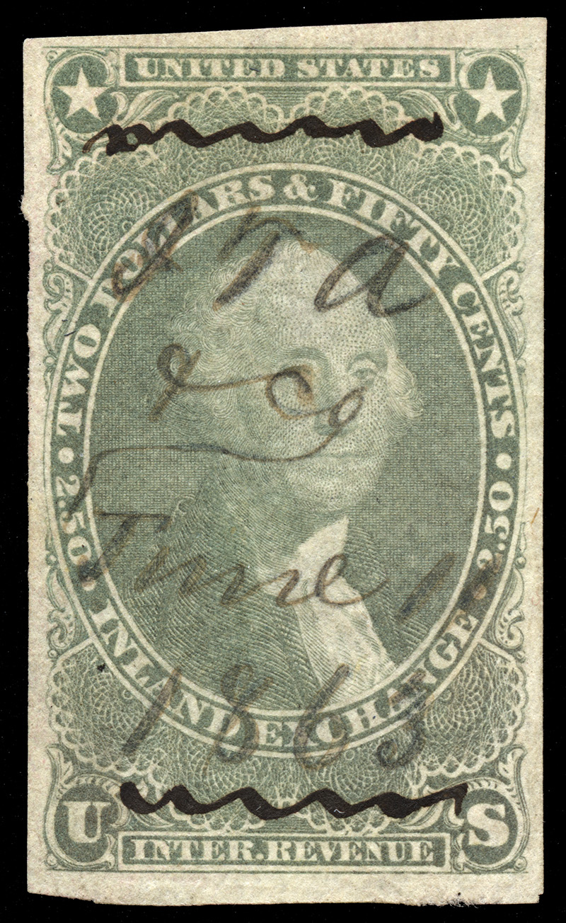 A wonderful example of a rarely seen socked-on-the-nose handstamp cancel on a high denomination. It also has a light cut cancel, and the catalog value displayed above reflects the cut cancel (value for this stamp without CC is $650.00).