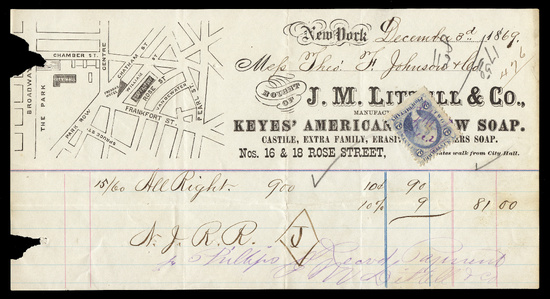 Scott Number: R13e Collection Reference No. for Communications: 5920 Denomination/Type: 2c Proprietary, ultramarine, perforated 2025 Scott Catalog Value (for a single stamp): $ 400.00 Estimated Retail Value: $ 375.00 What is this? Cancel Method: Manuscript Cancel Date: December 03, 1869 Cancel or Company Type: Merchant Company: J. M. Little & Co. City: New York State: New York Only the third known example of the 2c Proprietary ultramarine used on document, an improper use. If you have any information or comments about this cancel or stamp, please email me. |