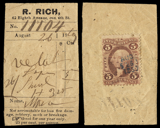 Scott Number: R27c Collection Reference No. for Communications: 5925 Denomination/Type: 5c Inland Exchange, red, perforated 2025 Scott Catalog Value (for a single stamp): $ 0.60 Estimated Retail Value: $ 175.00 What is this? Cancel Method: Handstamped - Multiple Line Cancel Color: Blue Cancel Date: August 26, 1869 Cancel or Company Type: Bank, Banker, or Broker Company: R. Rich City: New York State: New York Very scarce document type, a pawn ticket. Fewer than 20 reported examples of pawn tickets exist. If you have any information or comments about this cancel or stamp, please email me. |