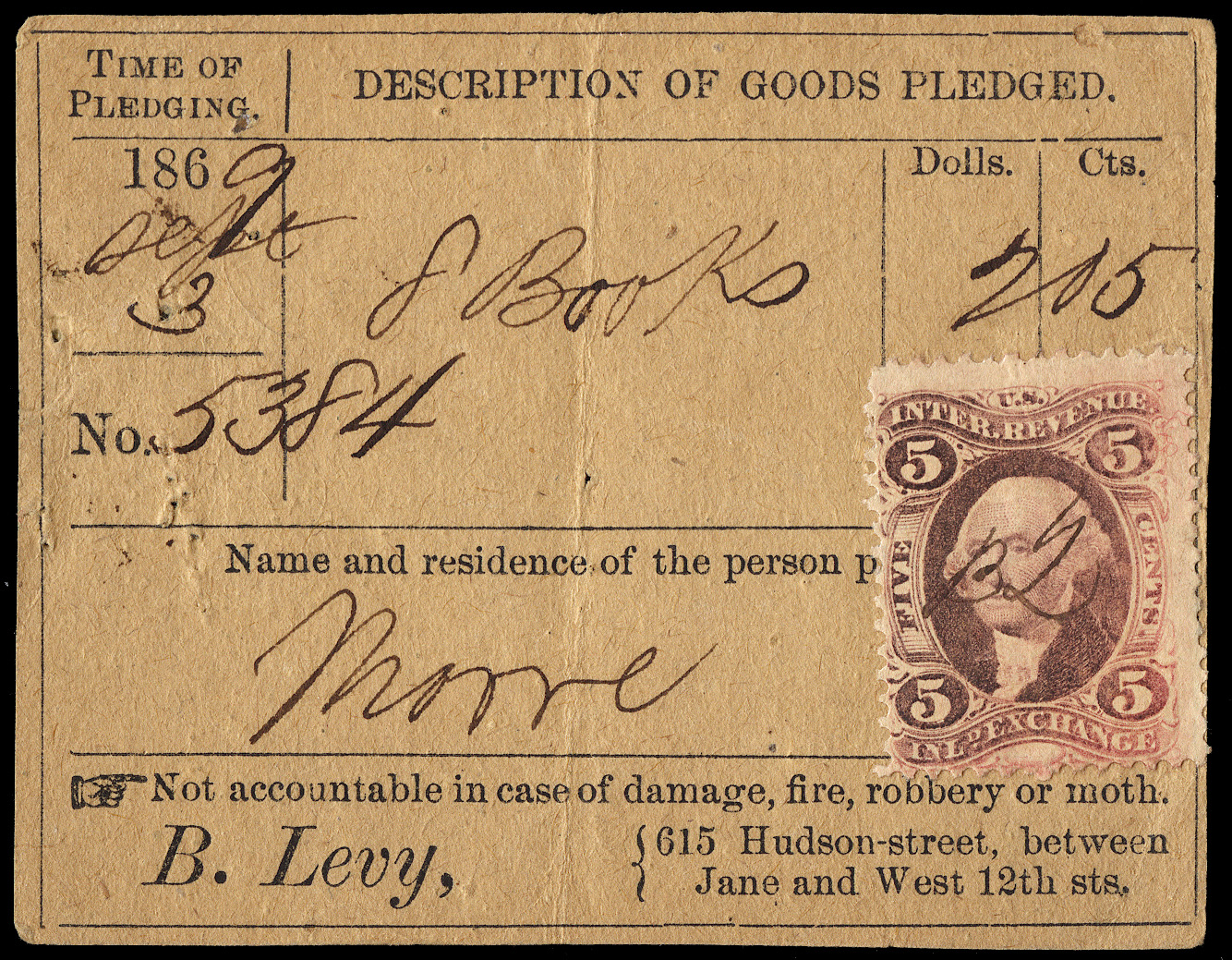 Scott Number: R27c Collection Reference No. for Communications: 5926 Denomination/Type: 5c Inland Exchange, red, perforated 2025 Scott Catalog Value (for a single stamp): $ 0.60 Estimated Retail Value: $ 225.00 What is this? Cancel Method: Manuscript Cancel Date: September 03, 1869 Cancel or Company Type: Bank, Banker, or Broker Company: Boas Levy City: New York State: New York Very scarce document type, a pawn ticket. Fewer than 20 reported examples of pawn tickets exist. If you have any information or comments about this cancel or stamp, please email me. |