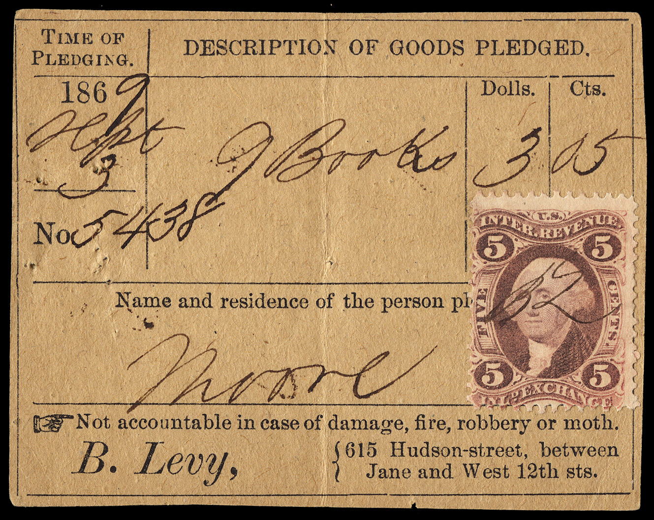 Scott Number: R27c Collection Reference No. for Communications: 5927 Denomination/Type: 5c Inland Exchange, red, perforated 2025 Scott Catalog Value (for a single stamp): $ 0.60 Estimated Retail Value: $ 225.00 What is this? Cancel Method: Manuscript Cancel Date: September 03, 1869 Cancel or Company Type: Bank, Banker, or Broker Company: Boas Levy City: New York State: New York Very scarce document type, a pawn ticket. Fewer than 20 reported examples of pawn tickets exist. If you have any information or comments about this cancel or stamp, please email me. |