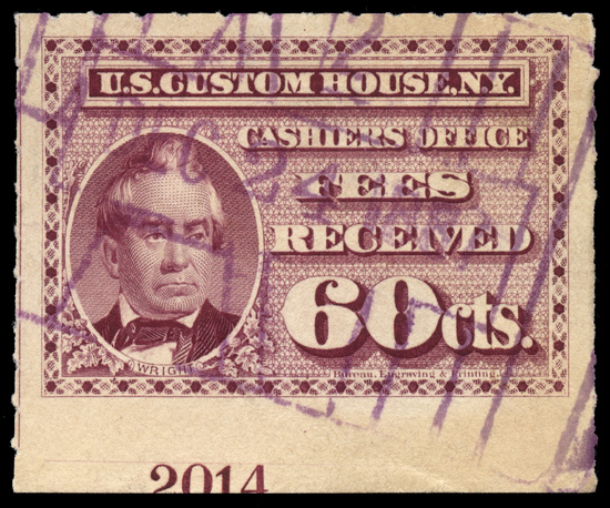 Scott Number: RL5 Collection Reference No. for Communications: 5931 Denomination/Type: Customs Fee, 60c red violet, rouletted 5.5 2025 Scott Catalog Value: $ 220.00 Estimated Retail Value: $ 200.00 What is this? Cancel Method: Handstamped - Other Cancel Color: Magenta/Purple Cancel Date: December 24, 1887 Cancel or Company Type: Law Firm, or Federal, State or Local Government Company: New York Custom House City: New York State: New York Plate number imprint capture. Plate #2014. Catalogue value shown is from the 2020 Durland Plate Number Catalogue. If you have any information or comments about this cancel or stamp, please email me. |