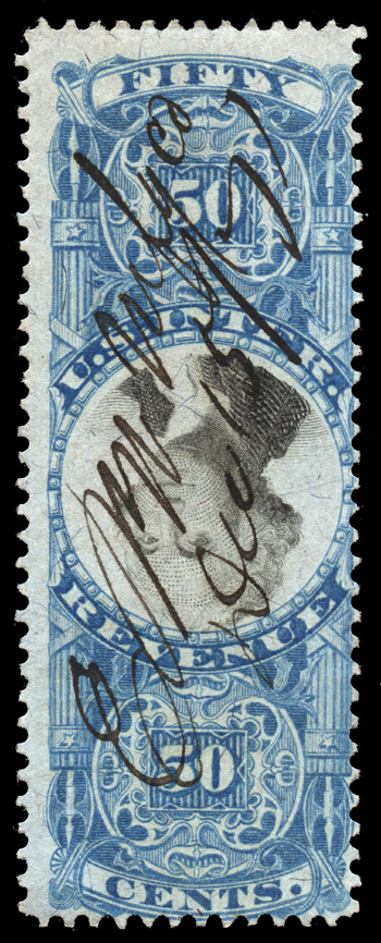 Scott Number: R115a Collection Reference No. for Communications: 5935 Denomination/Type: 50c blue and black, inverted center 2025 Scott Catalog Value (for a single stamp): $1050.00 Estimated Retail Value: $ 800.00 What is this? Cancel Method: Manuscript Cancel Date: December 15, 1871 Cancel or Company Type: Manufacturer or Industrial Trade Company: ???? Manufacturing Co. A rather ordinary looking example of the 50-cent inverted center... except for the fact that it is one of the plate positions exhibiting the double transfer in 'FIFTY'. Unlisted in Scott as an invert.