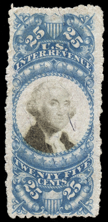 Scott Number: R112c Collection Reference No. for Communications: 5939 Denomination/Type: 25c blue and black, privately perforated, sewing machine perfs 2025 Scott Catalog Value (for a single stamp): $ 200.00 Estimated Retail Value: $ 175.00 What is this? Cancel Method: Manuscript Cancel or Company Type: Unknown Very lovely example with extremely faint (washed?) manuscript cancel. Almost looks unused. If you have any information or comments about this cancel or stamp, please email me. |