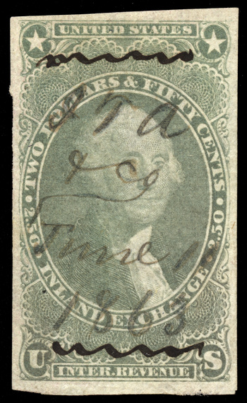 Scott Number: R84a Collection Reference No. for Communications: 5943 Denomination/Type: $2.50 Inland Exchange, purple, imperforate 2025 Scott Catalog Value (for a single stamp): $10000.00 Estimated Retail Value: $6000.00 What is this? Cancel Method: Manuscript Cancel Date: June 11, 1863 Cancel or Company Type: Unknown Very scarce sound example. Early gray shade, thin paper. If you have any information or comments about this cancel or stamp, please email me. |