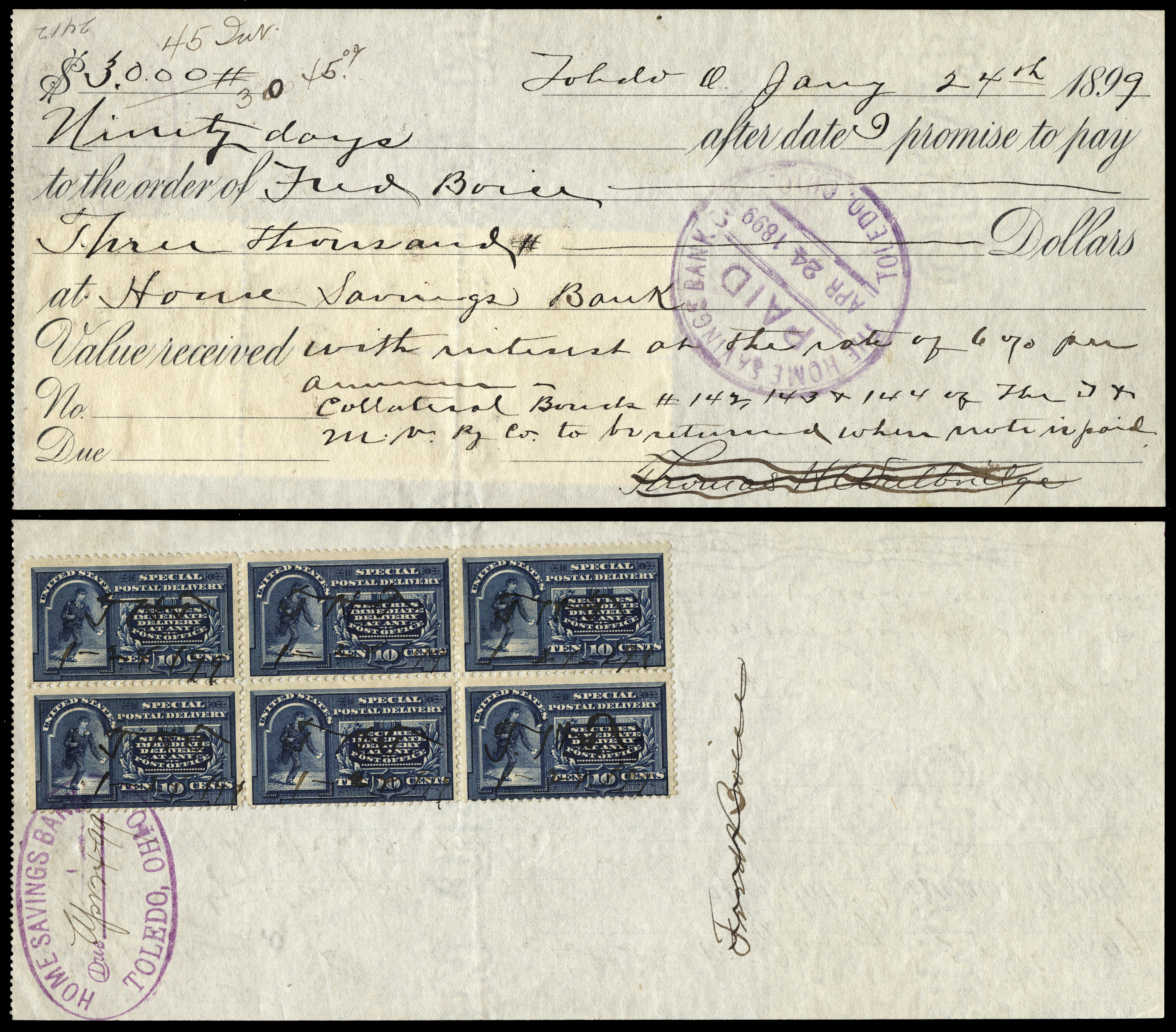 Scott Number: E5 Collection Reference No. for Communications: 5945 Estimated Retail Value: $3000.00 What is this? Cancel Method: Multiple Cancel Types Cancel Date: April 24, 1899 Cancel or Company Type: Bank, Banker, or Broker Company: Home Savings Bank City: Toledo State: Ohio An incredible one-of-a-kind document: a 90-day 1899 promissory note in the amount of $3,000. The tax rate was 2 cents per $100, meaning 60 cents in tax was due, improperly paid on the reverse by a block of 6 of the 10-cent U.S. Special Delivery of 1895 (Scott #5). All 6 stamps are manuscript canceled January 24, 1899, with the block also tied by a magenta oval Home Saving Bank handstamp on the date the loan was paid back, April 24, 1899. Ex-Markovits, from his award winning special delivery exhibit, where he indicated that this block is also the largest known used multiple. If you have any information or comments about this cancel or stamp, please email me. |